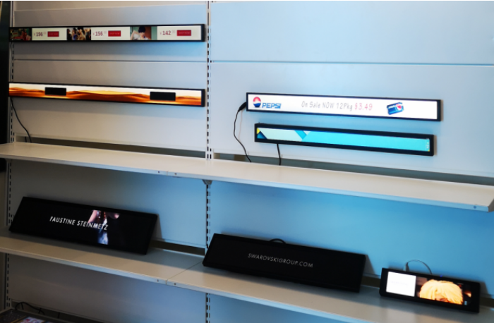 展会主要展品为各尺寸条形屏广告机以及裸眼3D显示器。 ·商超货架条形屏 价标系统 条码展示 可变价格 远程控制